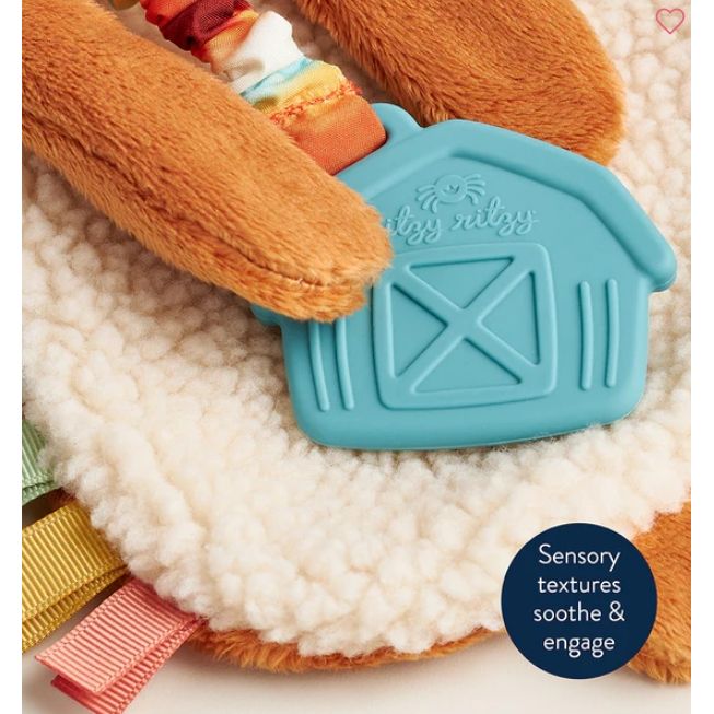 Our snuggly Itzy Friends Toy Collection Itzy Lovey™ features soft sherpa fabric and textured ribbons that baby will love to explore! A textured silicone teether helps massage and soothe sore gums, and crinkly arms and legs are sure to keep baby entertained with their gentle sound.